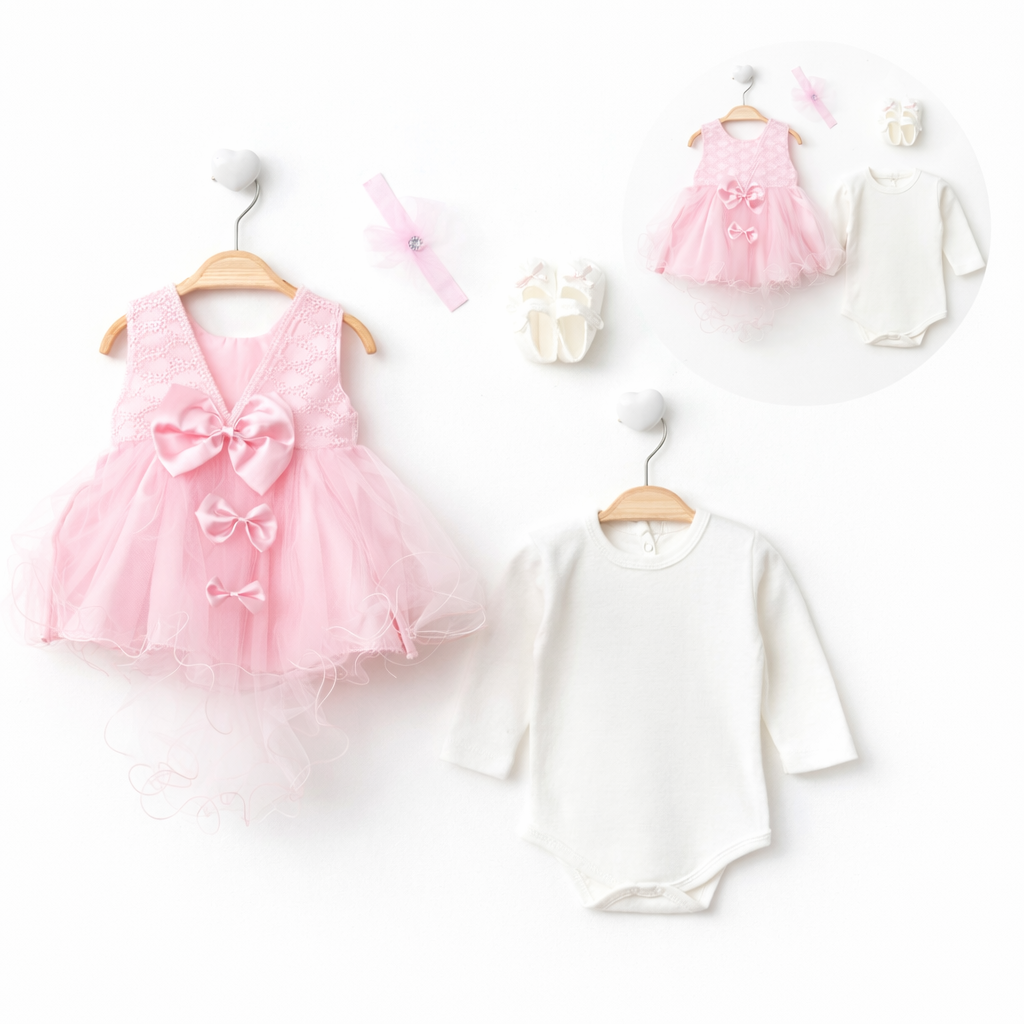 Елегантен и нежен комплект за новородено момиче, създаден с внимание към комфорта и безопасността на бебето. Подходящ за специални поводи като изписване от родилния дом, кръщене, фотосесии и семейни тържества.