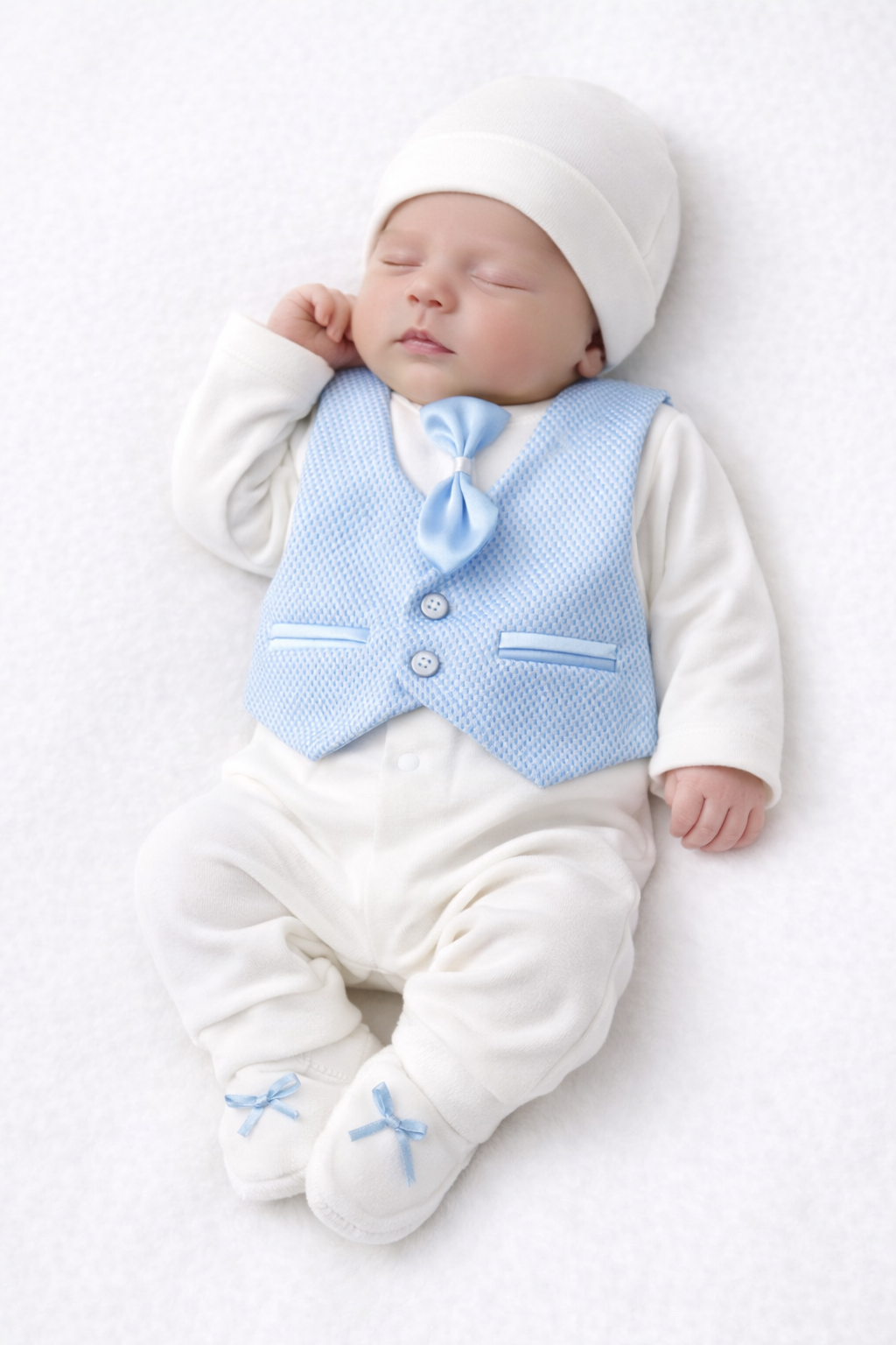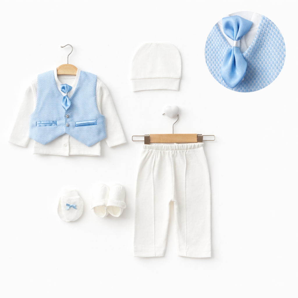 Стилен и елегантен комплект за новородено момче, създаден с внимание към комфорта и нуждите на бебето. Подходящ както за специални поводи, така и за първите дни след раждането – изписване от родилния дом, кръщене или семейни тържества.