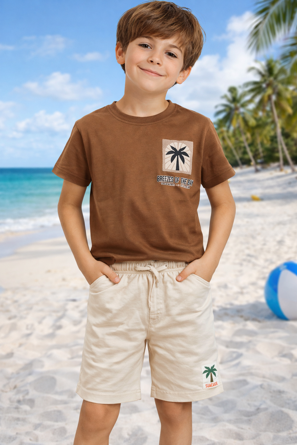 Представяме ви стилен детски летен комплект за момче, състоящ се от кафява тениска с модерен принт и бежови къси панталони. Комплектът е създаден за комфорт, свобода на движение и модерна визия през топлите месеци.