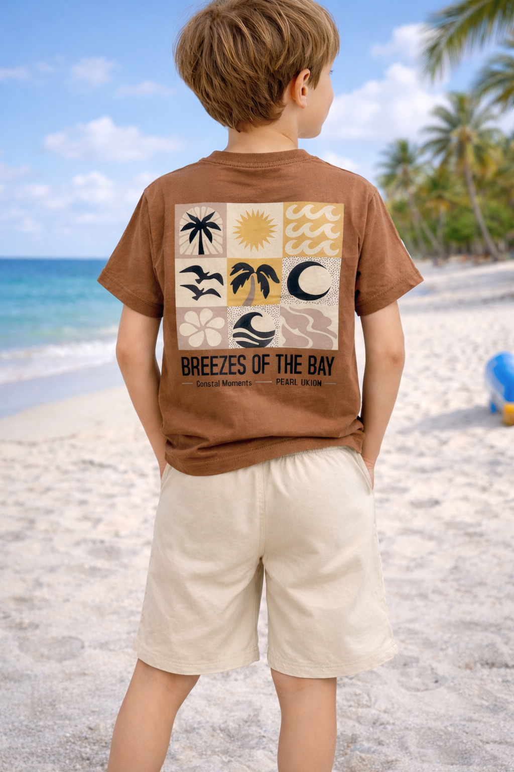 Тениската е с къс ръкав и ефектен гръбен дизайн с морска тематика, което я прави идеален избор за лятна разходка, ваканция или ежедневна визия. Късите панталони са в неутрален бежов цвят, с удобен ластик в талията и изчистен дизайн, без щампи отзад, което придава по-стилен и завършен вид.
