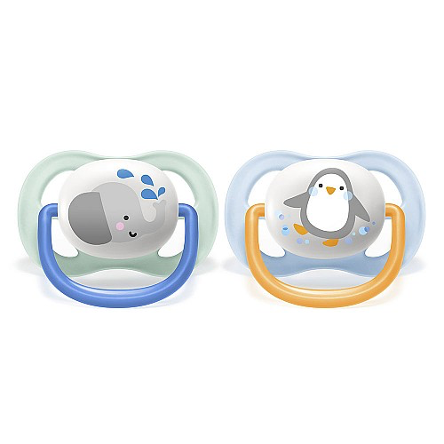 2 бр. ортодонтични залъгалки Philips AVENT SCF080/05 Ultra Air Animals 0-6м с декорация Слон и Пингвин в кутия за стерилизиране