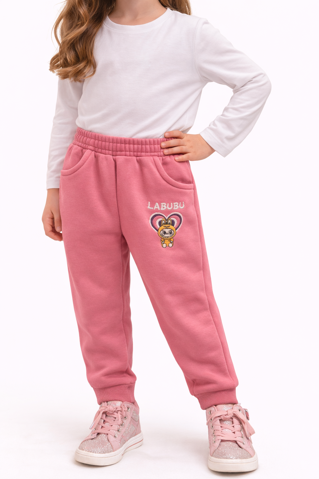 Ватиран детски спортен панталон в нежен розов цвят с бродирана апликация LABUBU. Моделът е изработен от мека и топла материя с вата от вътрешната страна, което го прави идеален за есенно-зимния сезон. Еластичната талия осигурява удобство и добро прилепване, а маншетите в долната част допринасят за комфорт и практичност при носене. Панталонът е подходящ за ежедневие, разходки, детска градина и игра.