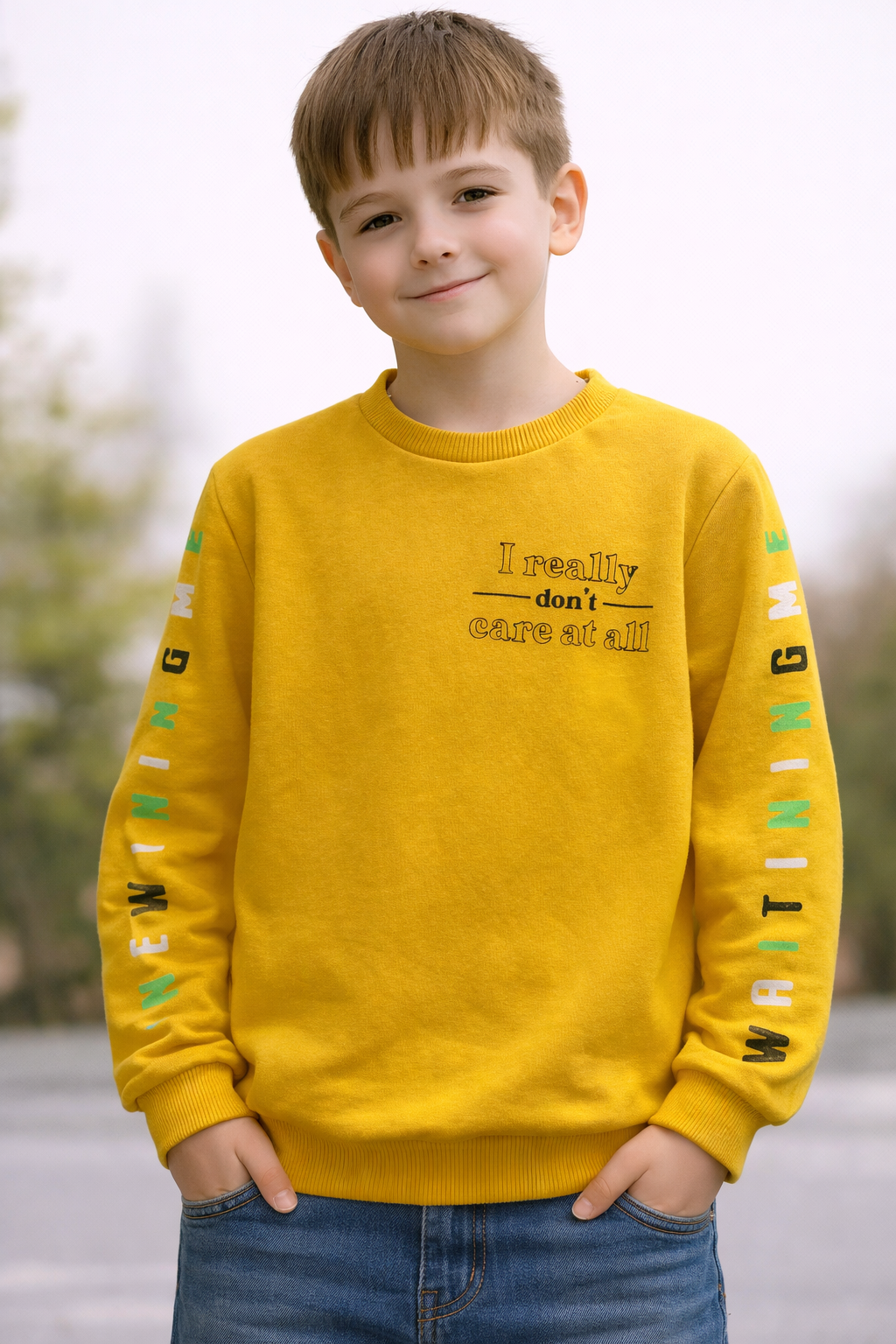 Стилна и удобна детска блуза, създадена за ежедневието на активните деца. Моделът е в свеж жълт цвят с модерен текстов принт отпред и декоративни надписи по ръкавите, които придават съвременен и младежки облик.