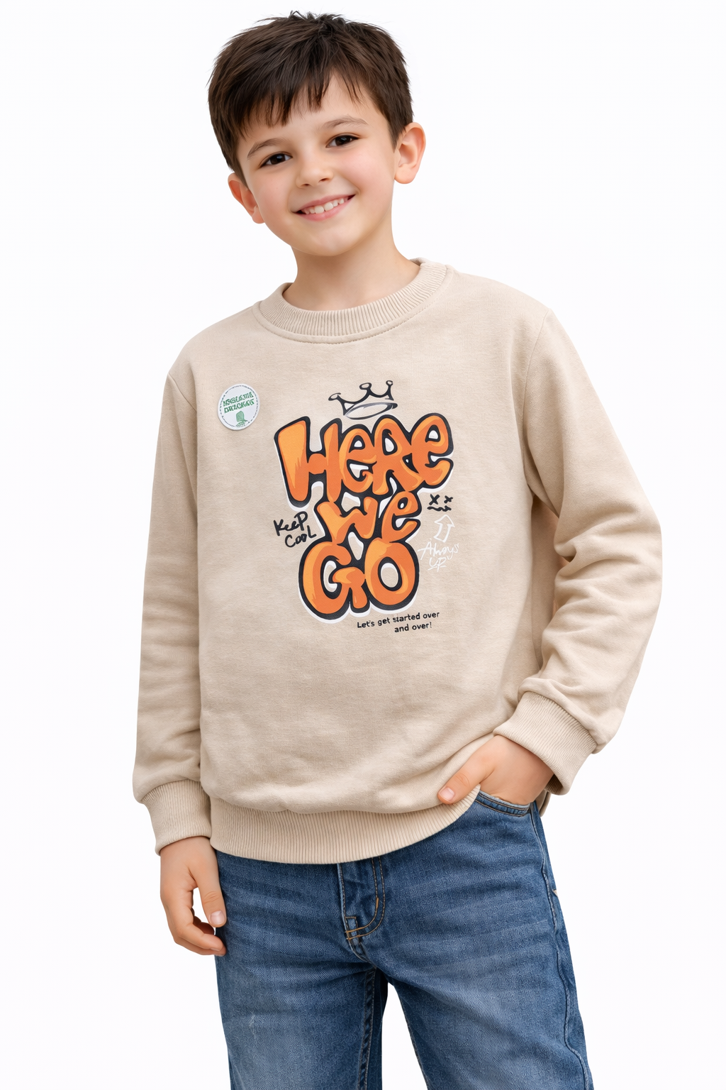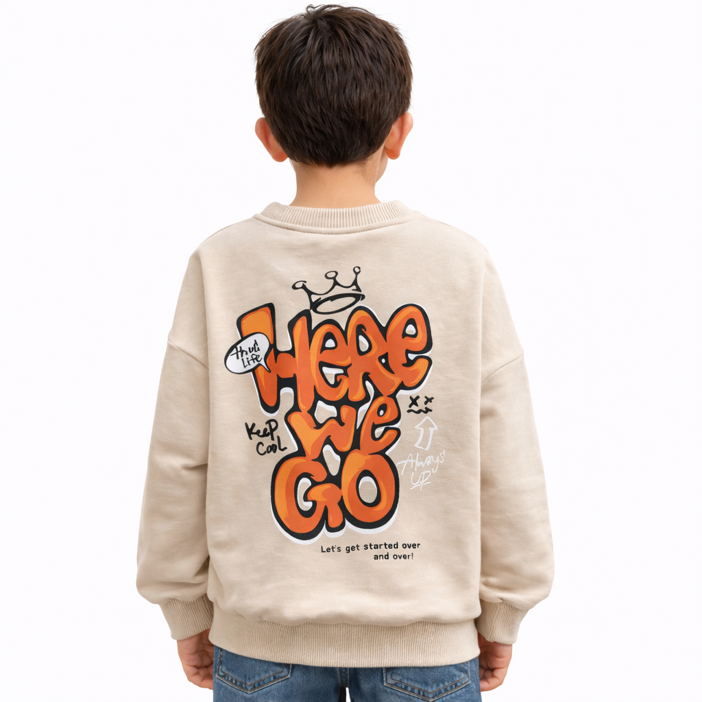 Стилна и удобна детска блуза с модерен графити дизайн, създадена за малките любители на градската визия. Моделът впечатлява с атрактивен надпис “Here We Go”, който присъства както отпред, така и на гърба, и придава характерен street style акцент.