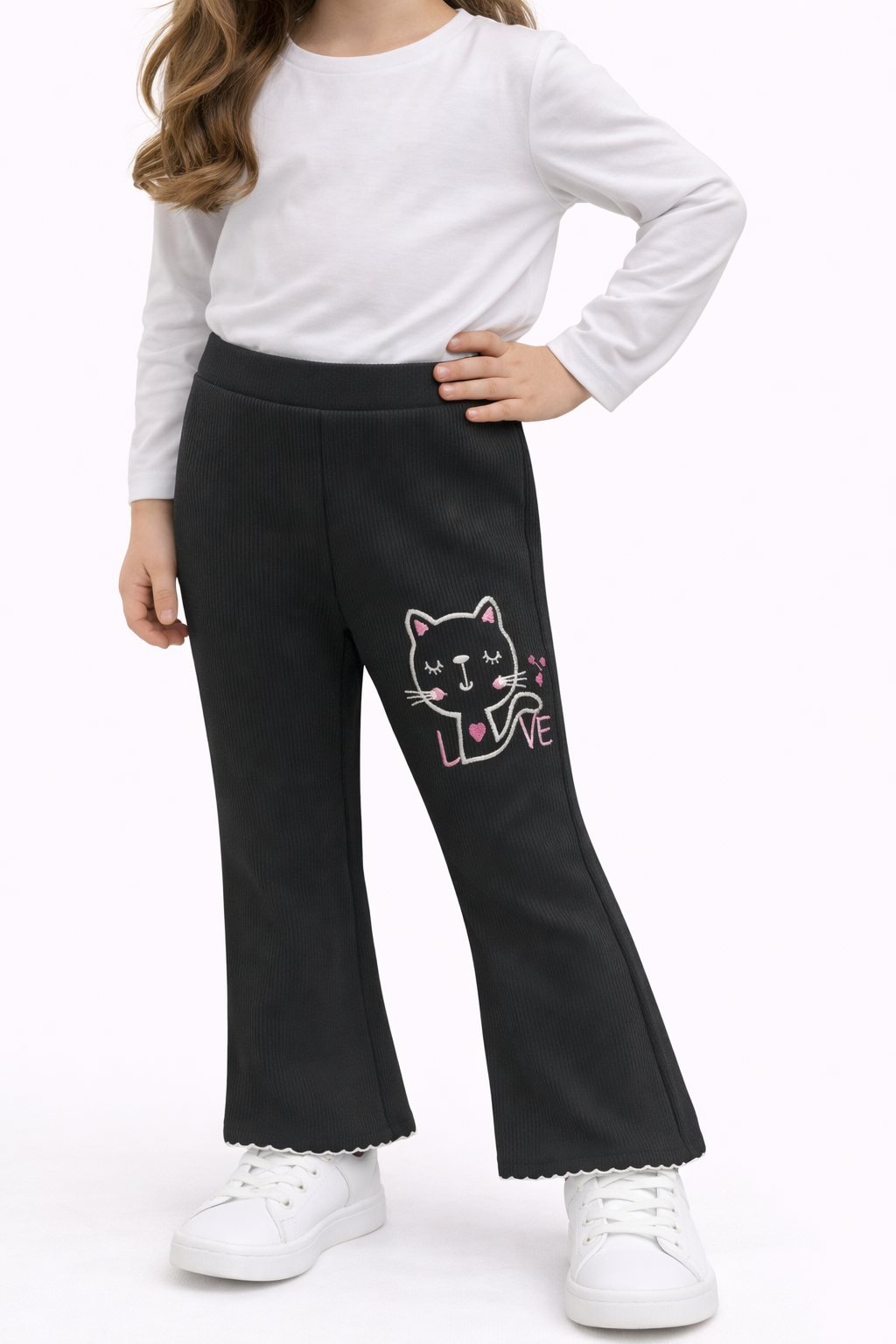 Детски клин за момиче, изработен от мек и еластичен рипс плат, който осигурява комфорт и свобода на движение през целия ден. Моделът е с еластична талия за лесно обличане и отлично прилягане. Акцентът е нежната бродерия с коте и надпис „Love“, която придава закачлив и стилен вид.