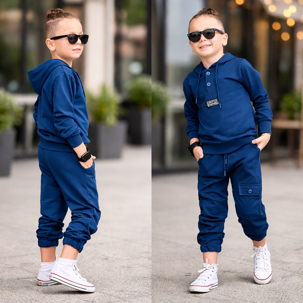 Този детски спортен комплект е създаден за комфорт и практичност при ежедневно носене. Подходящ е за активни деца и предлага удобство както при разходки, така и при игра или свободно време.