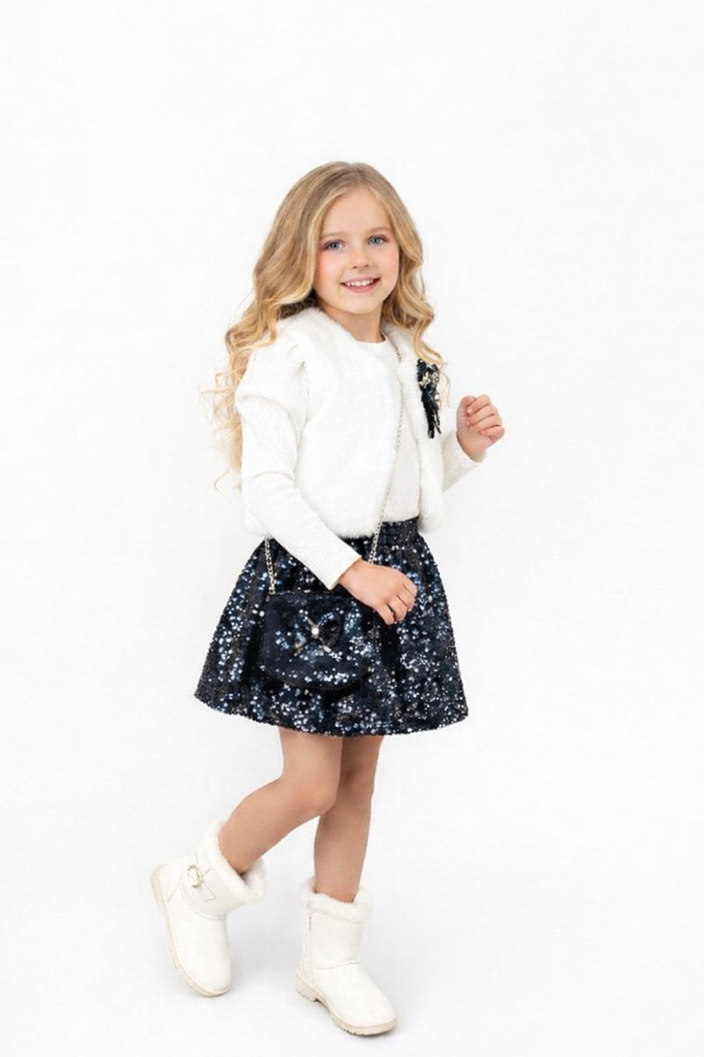 Елегантен детски комплект, създаден да впечатлява с фин стил и практичност. Комплектът включва пухен елек, който осигурява топлина и завършен вид, стилна пола с нежен блясък, мека и удобна блузка, както и малка чанта – перфектният акцент за малките дами.