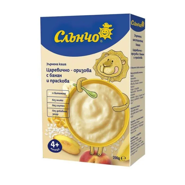 Слънчо зърнена инстантна каша „Царевично-оризова с банан и праскова“ (4+ месеца) – 200 г