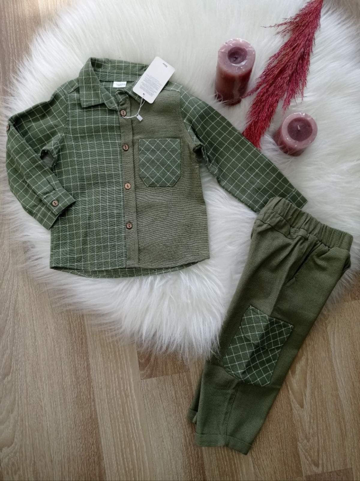 Комплектът включва зелена риза с дълъг ръкав и комфортен панталон, създаден за движение и игри.