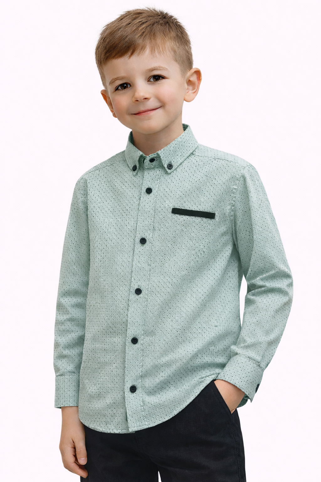 Стилна детска риза с изчистен дизайн и фин десен в зелени тонове, подходяща както за ежедневието, така и за по-официални поводи. Моделът е с тик-так копчета в черен цвят, които придават модерен акцент и улесняват обличането.