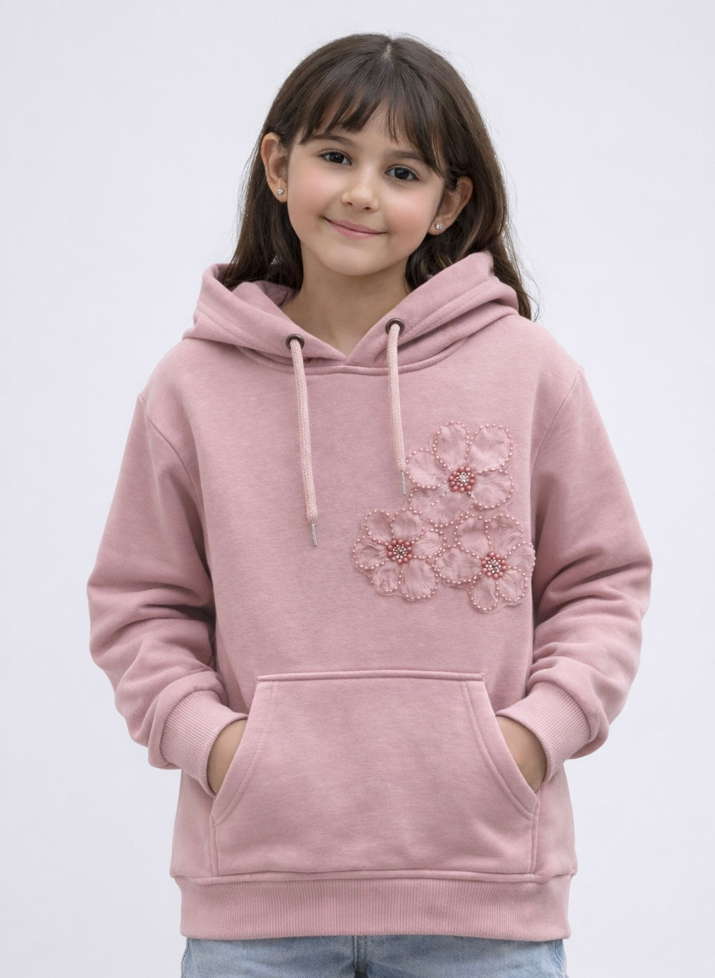 Акцентът на суичъра са красивите 3D декоративни цветя с фини камъчета, които придават нежен и елегантен вид. Предният джоб тип „кенгуру“ допълва удобството и функционалността на модела.