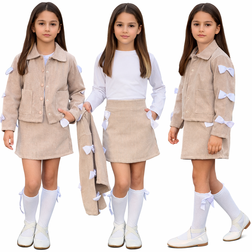 Детски елегантен комплект пола със сатенени панделки и сако